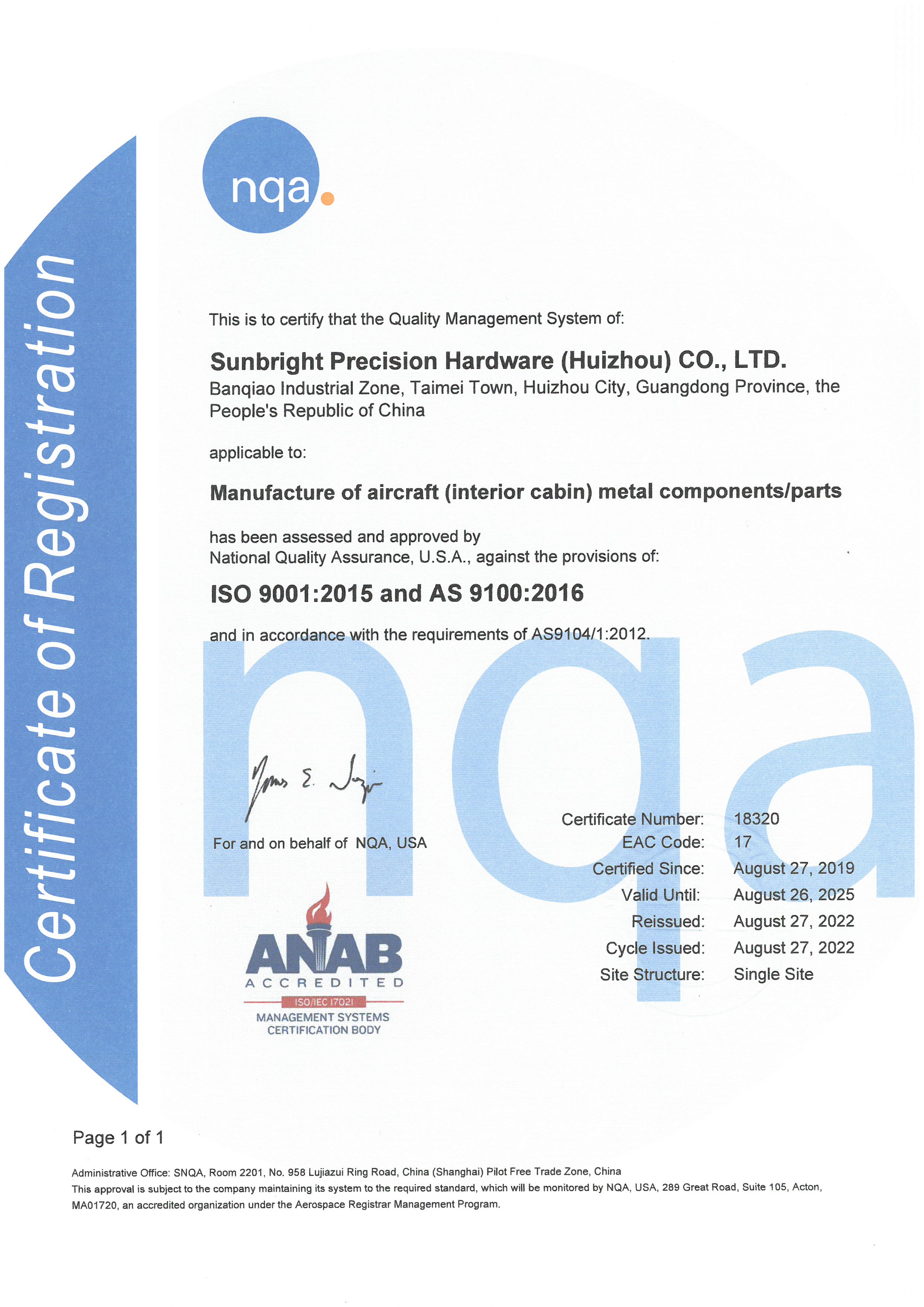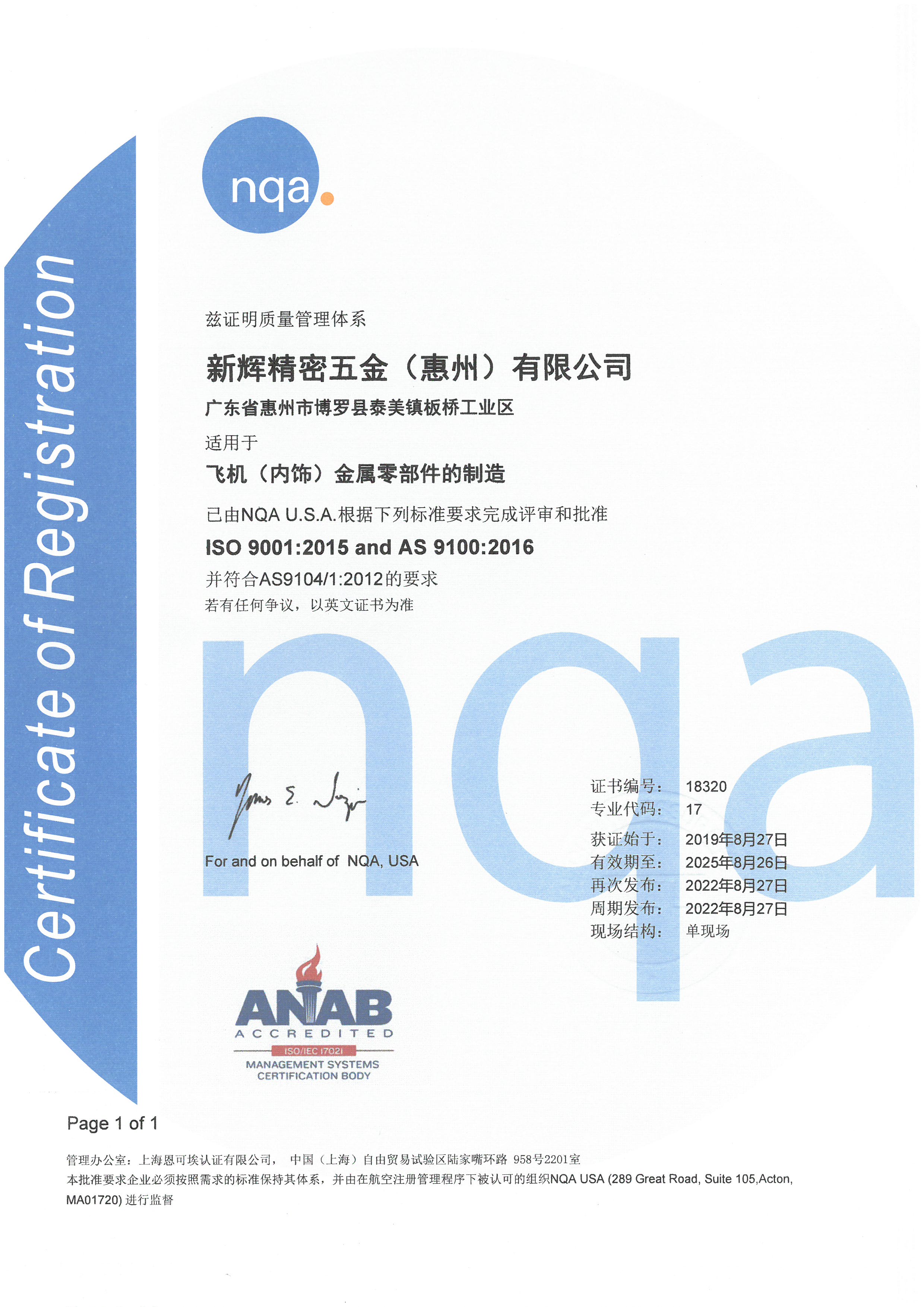 公司通過ISO9001認證、AS9100航空航天質量管理體系標準認證、磁粉無損探傷檢測工序的NADCAP認證、IATF 16949認證。2018年導入ERP系統,2020年推行精益生產。公司擁有專業的管理團隊,雄厚的技術力量,先進的生產設備,高精度的測量設備,完善的管理制度,為客戶提供優質的產品與服務。